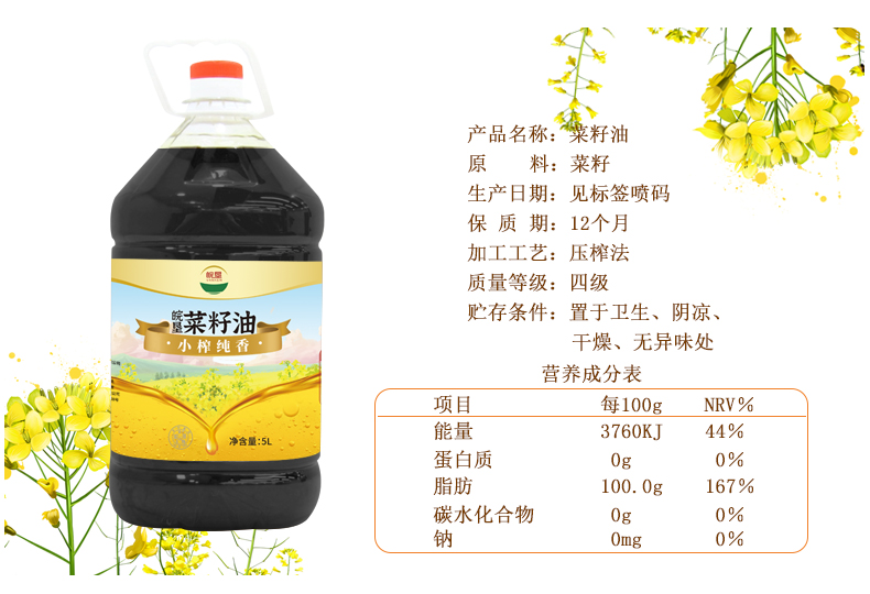 皖墾菜籽油5L小榨純香非轉基因